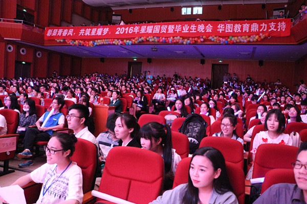 At 7 o’clock on the evening of May 28, the grand evening party “ Starlight of International Trade”, organized by school’s student union and all students of year 2014, had its opening ceremony in Jiaoqiao’s auditorium. Leaders and some teachers were present and expressed warm blessings to all students of the school.